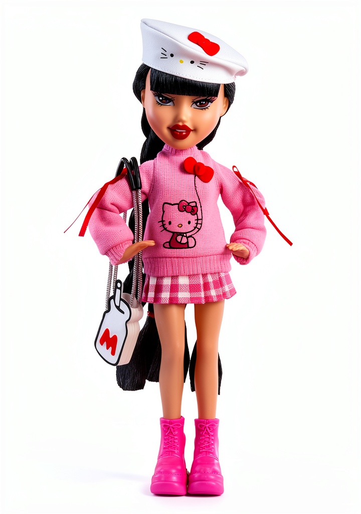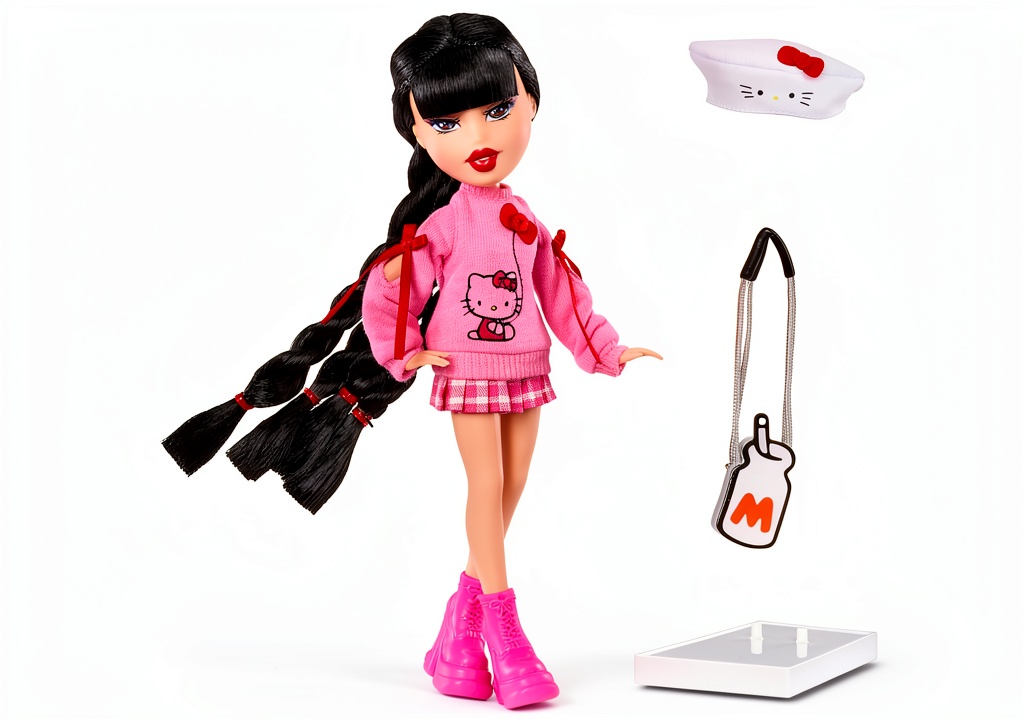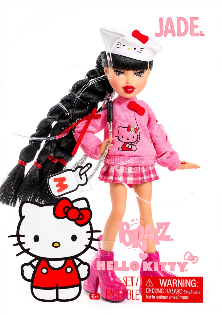 The Bratz x Hello Kitty Jade doll combines the bold fashion of Bratz with the adorable charm of Hello Kitty. This special edition doll stands 9 inches tall, weighs 12 ounces, and features detailed styling with pink bows, a chunky sweater, plaid skirt, and chunky boots. Designed for children aged 6 and up, it includes accessories like a milk bottle crossbody bag and a beret, all packaged in iconic Hello Kitty-themed box with a display window. Manufactured by MGA Entertainment, model number 595670, it’s a top-rated collectible with high customer reviews.