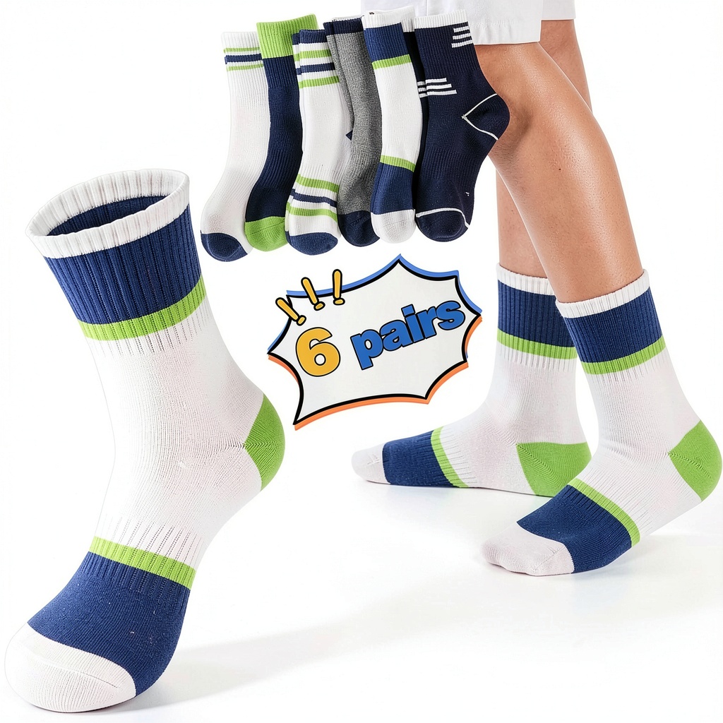 Welwoos presents a 6-pair set of kids athletic socks designed for active boys and girls. These crew socks are constructed from 85% cotton and 15% spandex, offering moisture-wicking and breathable properties to keep feet dry and comfortable during physical activities. Available in sizes 3-5T, 5-8 Years, and 9-15 Years, they feature high-stretch cuffs and arch support for a secure fit that reduces fatigue. With vibrant colors like Splice/Grey/Blue, Black, and Pink/Yellow Green/White/Purple/Beige, these socks are versatile for sports, school, or casual wear.